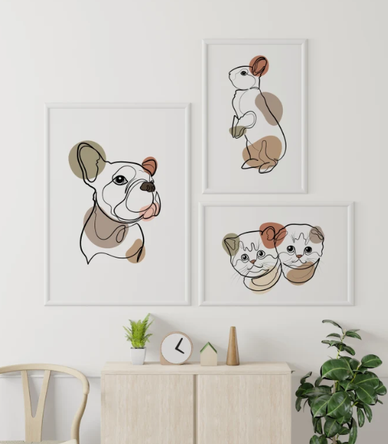 Perfect for modern homes, this clean line-art style uses bold colour and flow to capture your pet’s form in a simple, striking way. A beautiful balance of art and personality.